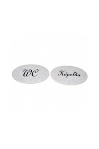Plastové 2-dielne označenie na dvere s nápisom kúpeľňa na jednom kuse a WC na druhom kuse. Má oválny tvar. Rozmery má 6,5 x 10,5 cm. Pripevňuje sa p..